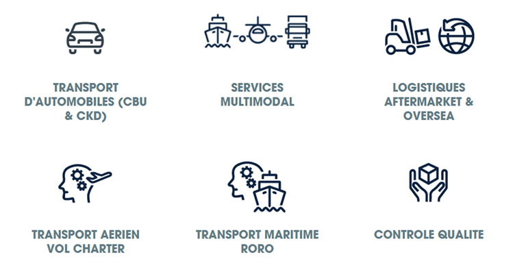 - Transport à l'international pour une large variété de véhicules, solutions adaptées aux Complet Build Units (CBU), complete Knock Down (CKD), mais aussi prototypes ou véhicules neufs.